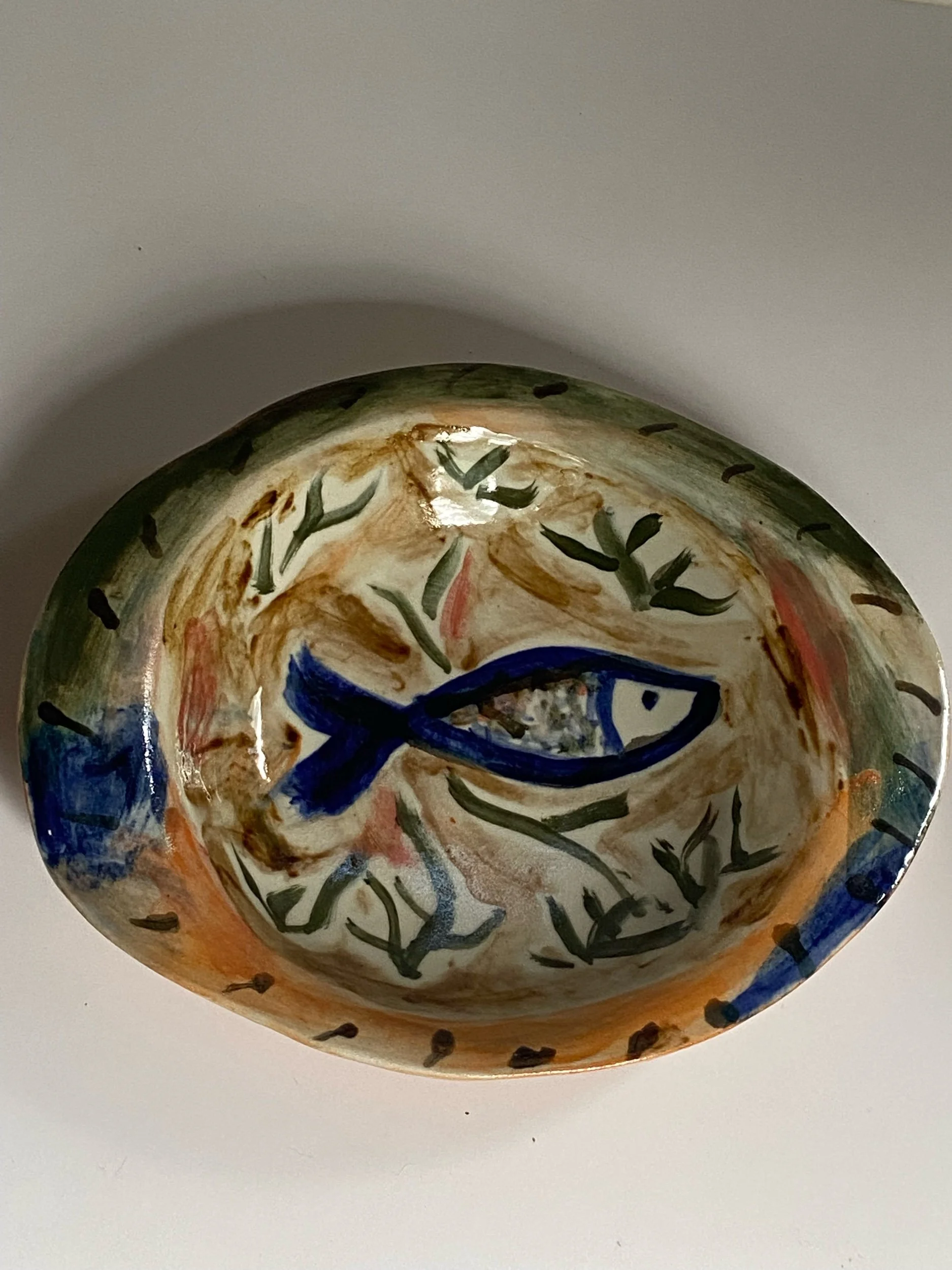 Shop › Hand painted fish oval plate Image 1 of 5 Image 2 of 5 Image 3 of 5 Image 4 of 5 Image 5 of 5 Hand painted fish oval plate $220.00 The oval plate is about 2” deep and made to serve small sides One of a kind and hand painted Add To Cart Added! The oval plate is about 2” deep and made to serve small sides One of a kind and hand painted
