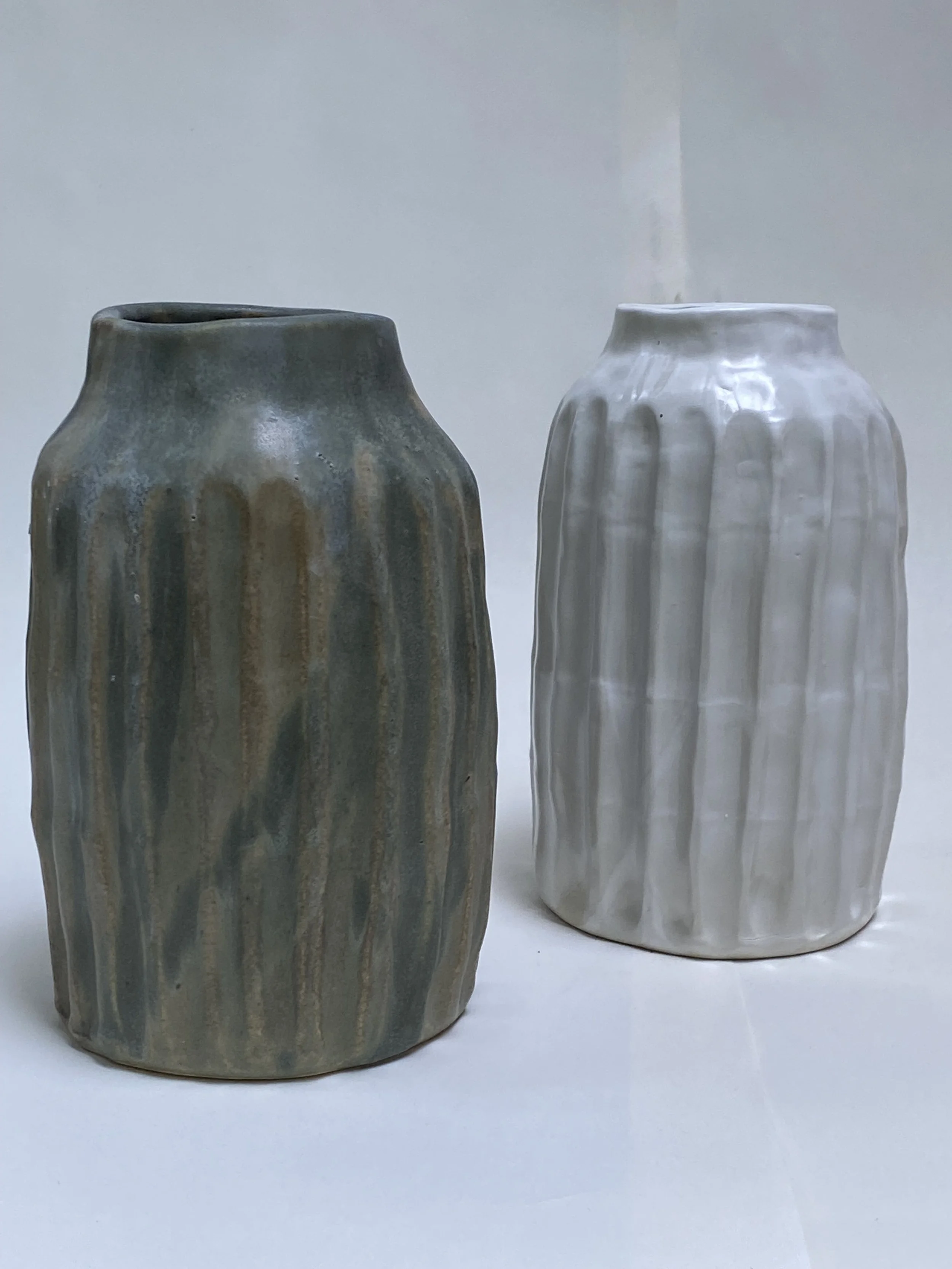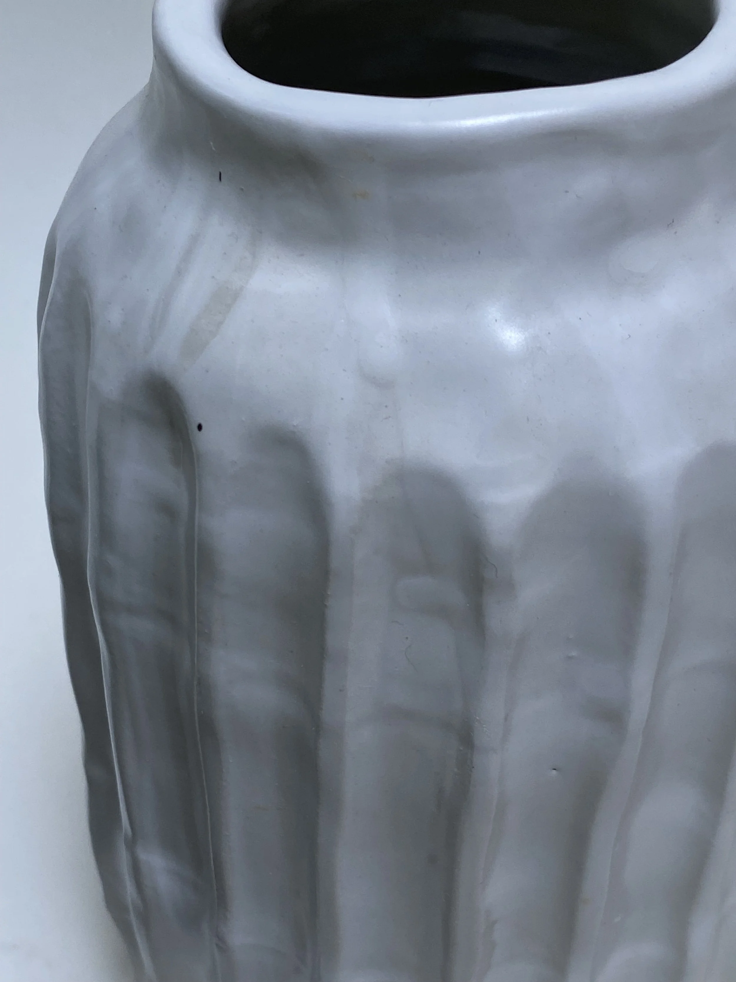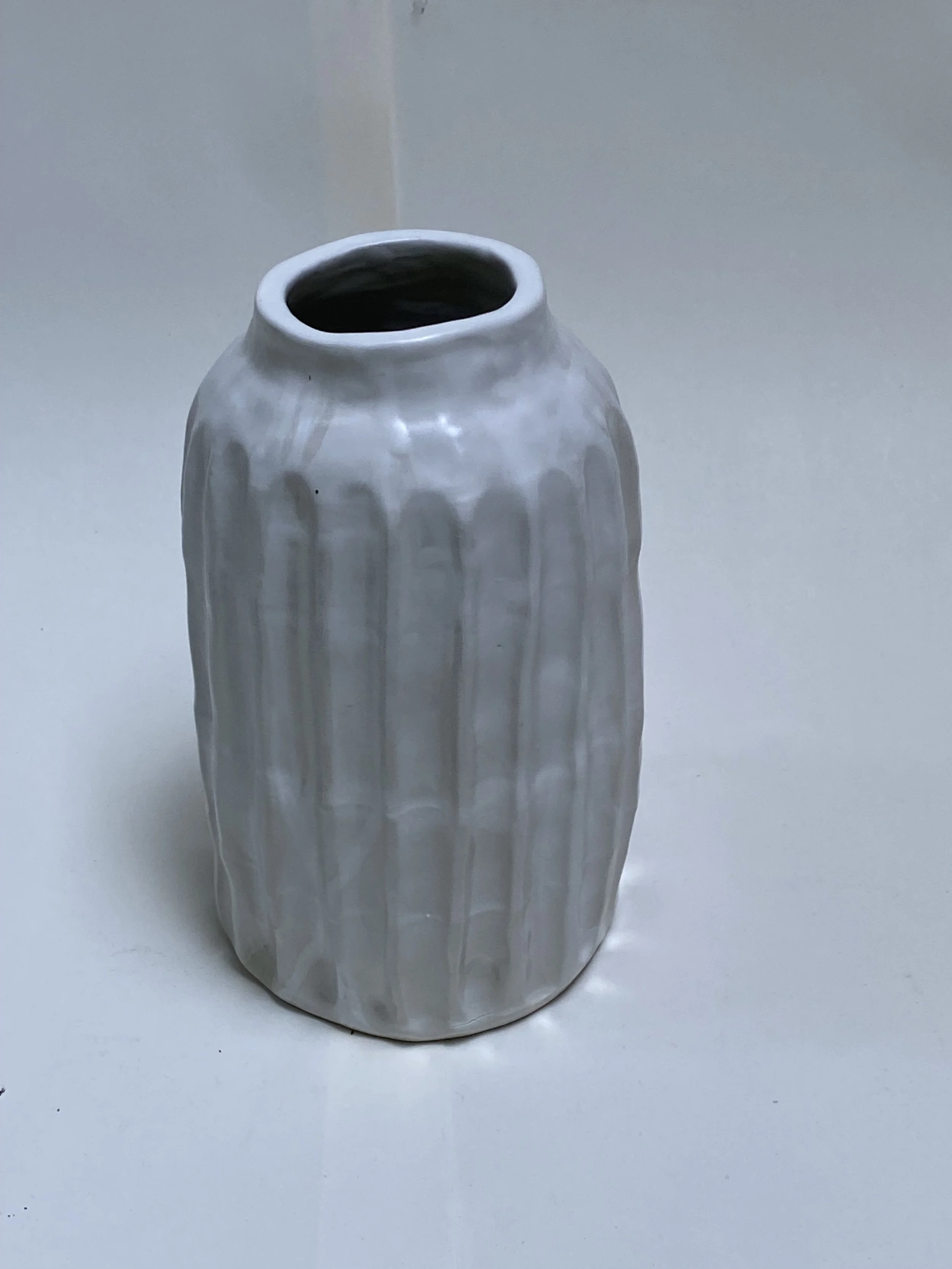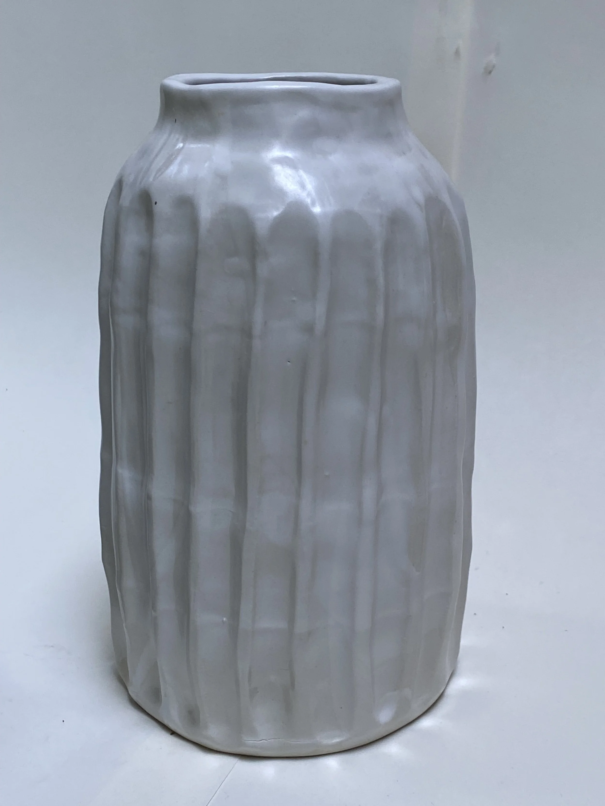 Shop › corrugated white vase Image 1 of 4 Image 2 of 4 Image 3 of 4 Image 4 of 4 corrugated white vase $210.00 handmade in white stoneware with ridges and satin white glossapprox height of 8” Add To Cart Added! handmade in white stoneware with ridges and satin white glossapprox height of 8”
